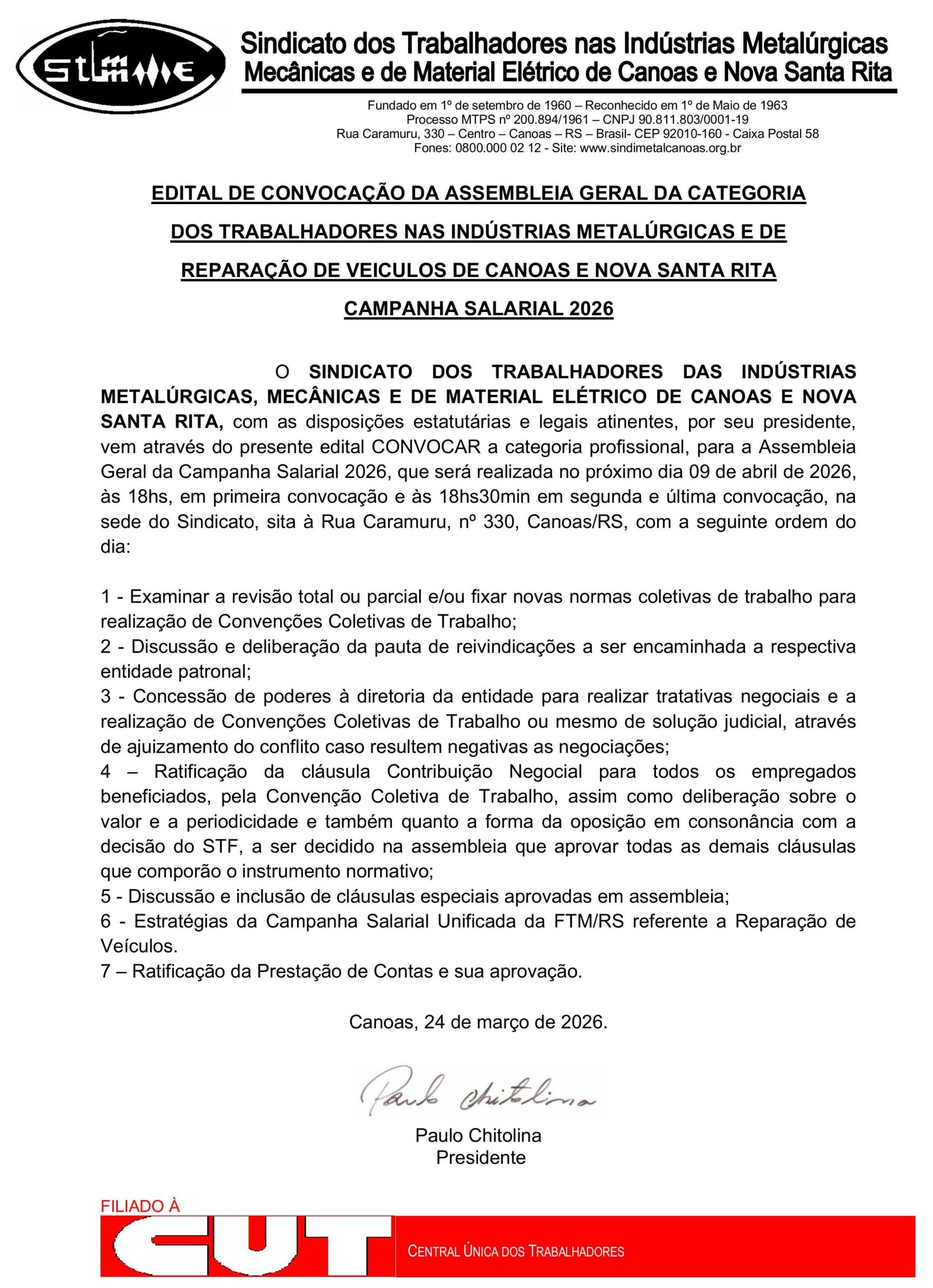 Assembleia Geral e Lançamento da Campanha Salarial dos Metalúrgicos/as de Canoas e NSRita ocorre no próximo dia 09 de abril